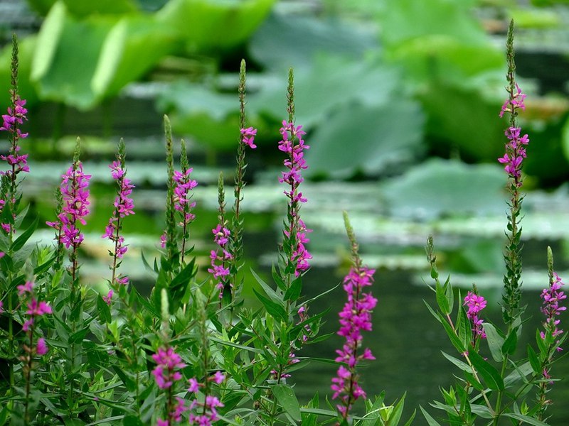 千屈菜又叫水枝柳、水柳、對葉蓮等,多年水生宿根草本植物,植株高約1米,直立生長,主桿上有許多分枝,葉子對生,披針形。葉子長4~6cm,寬1cm左右。總狀花絮長在較上面,長約30cm,花朵簇生。